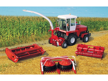 - Жатка для грубостебельных сельскохозяйственных кормовых культур. Конструктивная особенность адаптера – способность срезать стебли на заданной высоте вне зависимости от схем и способов посева с учетом рельефа поля. Подача растений в питатель идет корнем вперед, это исключает повреждение и потерю початков. Боковые делители ограничивают проход, поднимают полегшие растения и, тем самым, снижают потери до минимума.