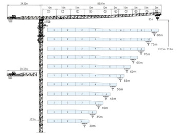 Одним из ключевых преимуществ модели является высота под крюком до 79 метров, что позволяет вести монтажные работы на значительной высоте, включая строительство верхних этажей небоскрёбов и других высотных сооружений. Длина стрелы 40 метров обеспечивает широкий радиус действия, позволяя охватывать обширные участки строительной площадки без необходимости частого перемещения крана. При этом грузоподъёмность на конце стрелы составляет 9,5 тонн, что значительно расширяет возможности крана по работе с тяжёлыми грузами даже на максимальном вылете.