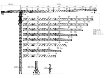 Конструкция крана выполнена в варианте без оголовка, что снижает высоту всей установки и облегчает её монтаж в условиях плотной городской застройки. Максимальная высота подъёма крюка достигает 70 метров, при этом длина стрелы составляет 65 метров. На максимальном вылете кран способен поднимать до 2,2 тонн, а при минимальном радиусе рабочая грузоподъёмность достигает 10 тонн. Башенная секция имеет размеры 2,0×2,0×3,0 метра, что обеспечивает высокую устойчивость и жёсткость конструкции при работе на больших высотах. Надёжная система привода и современное управление позволяют оператору точно контролировать все движения крана, обеспечивая плавность работы и безопасность.